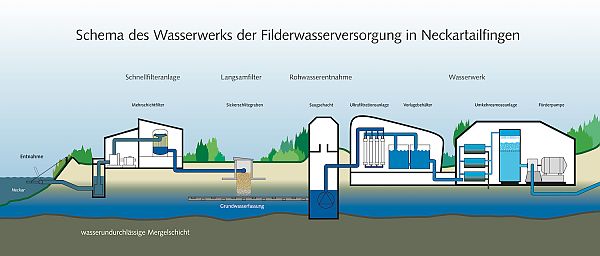 Das Wasserwerk in Neckartailfingen gewinnt sein Wasser aus dem teilweise mit Neckarwasser (bis zu 40%) angereichertem Grundwasser. Das Neckarwasser wird in einer Schnellfilteranlage von organischen und weiteren Trübstoffen befreit und dem Grundwasser über Sickerschlitze durch eine Sandschicht, die als Langsamfilter biologisch wirksam ist, zugefügt.